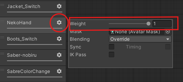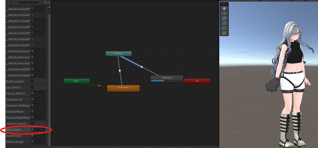 ParametersからNekoHandの値を1か0かに書き換えてみて、AnimationControllerがうまく遷移するかを確認する。1にしたら猫ハンド、0にしたら人間の手になる設定なので、これでヨシ