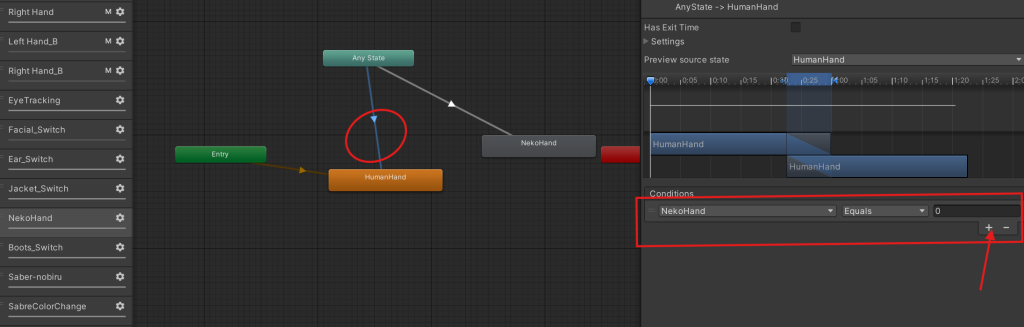ここではNekoHand(という名前のパラメーター)が0ならばHumanHandに遷移する、と設定している↓