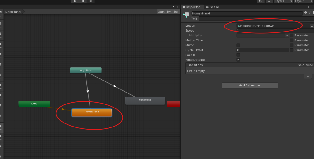 HumanHandとNekoHandそれぞれのステートにアニメーションを設定していく。ここではHumanHandのステートに、NekonoteOFF-SaberONというアニメーションを割り当てている。