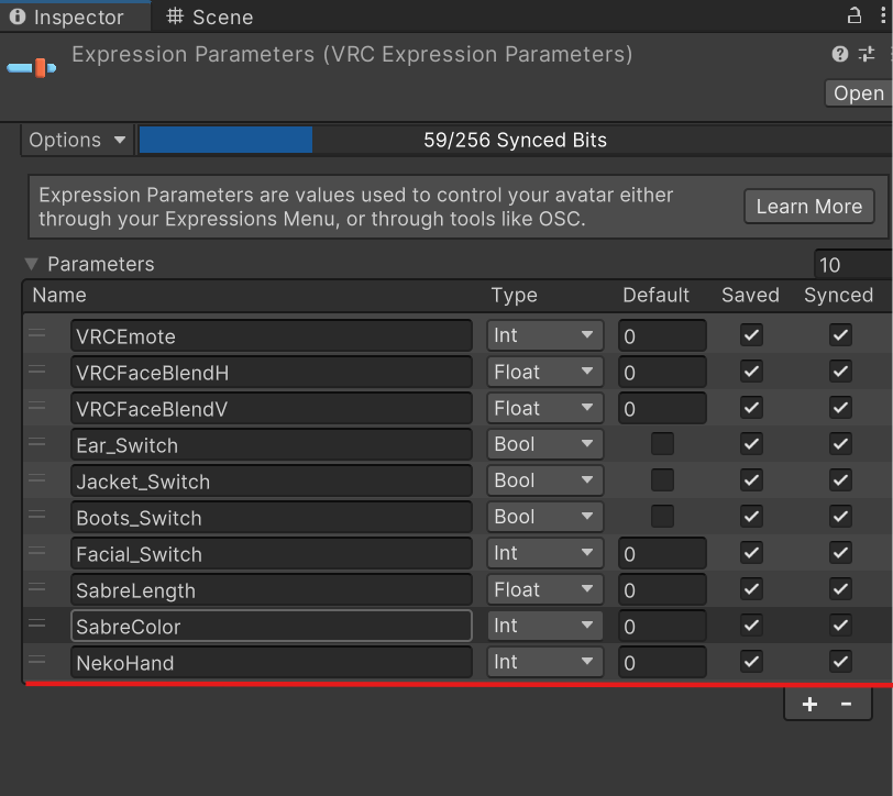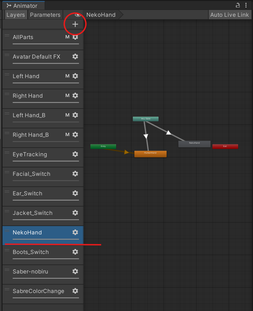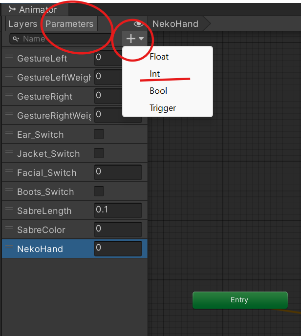 +を押して、NekoHandをパラメーター追加する。IntとかBoolとかを間違えないように
