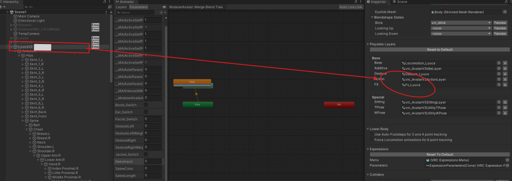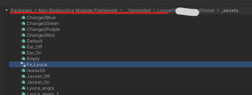 Packages > Non-Destructive….というパスになっているところに注目。ModularAvatarが自動生成するフォルダなので、ここにあるFx_xxxxxを選ばないといけないというわけ。