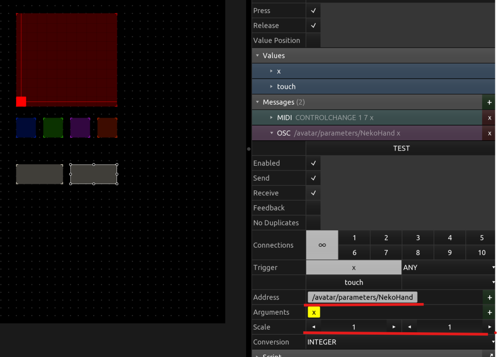 TouchOSCなどのソフトで送り先を127.0.0.1 : 9000にして、送付先アドレスは /avatar/parameters/NekoHand